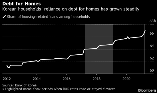 去年年底,韓國家庭債務與收入之比為171.1%,位居世界前列。 其中大部分債務是用來買房,而且即便央行在加息,這個比例仍在上升。
