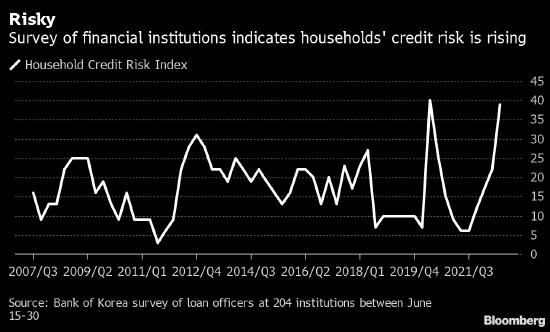 私人銀行也更加重視債務問題。 韓國央行上月發佈的一項調查顯示,銀行預計本季度家庭的信用風險將上升至與疫情開始時大致相同的水準。