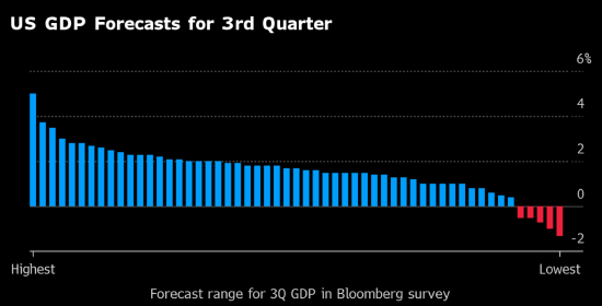 美國政府上周公佈數據顯示4-6月份GDP連續第二個季度下滑,摺合年率下降0.9%,媒體調查的經濟學家預期中值為增長0.4%。