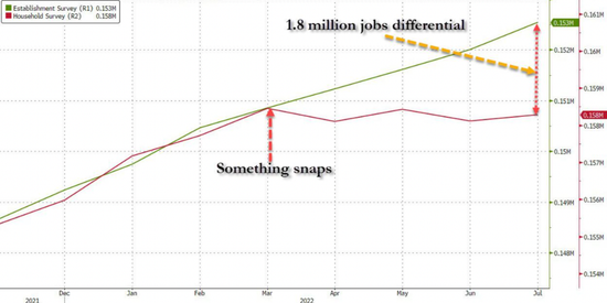 美國6月和7月非農報告出現了一些非常奇怪的情況,其中月度就業報告的家庭和機構調查之間出現了明顯的分歧,自3月份以來,前者在下滑,而後者每個月都在上升。