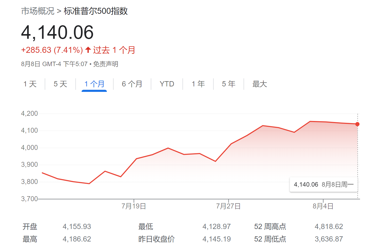 美銀策略師則表示,他們預計標普500指數在9月份美聯儲下次會議前的交易區間為3800至4200點,周一標普500指數收在4140點。