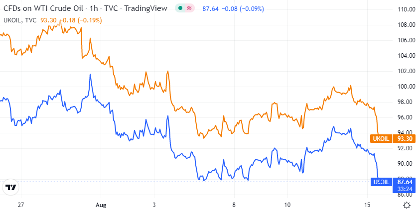 具體行情顯示,紐約商品交易所9月交貨的WTI原油期貨價格下跌超4.5美元,至每桶87.55美元,日內跌幅達4.8%; 10月交貨的布倫特原油期貨價格下跌超4.8美元,至每桶93.33美元,日內一度跌超5%。