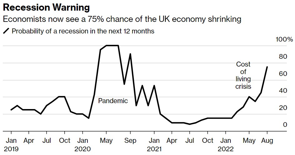與英國央行不同,經濟學家認為英國將避免衰退,第四季度小幅收縮,然後在2023年最初幾個月陷入停滯,然後恢復溫和增長。 然而,經濟衰退的風險正在增加。 目前估計,衰退的可能性為75%,大大高於7月初的44%,高於自2020年9月疫情肆虐以來的任何時候。 彭博社的調查是在8月5日至8月11日之間進行的。