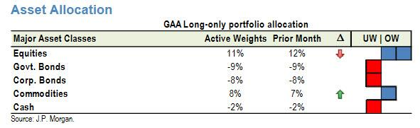 下圖顯示,儘管摩根大通表示,從風險配置的角度考慮,其下調了股票投資的比例,並提高了大宗商品的配置,但是事實上,股票仍然是摩根大通的投資重點。