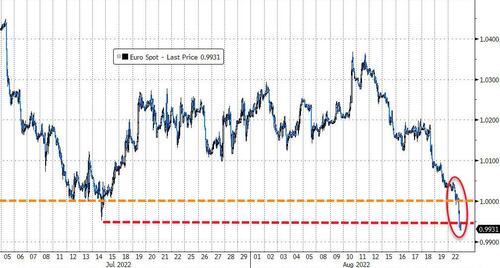 美元的再度崛起,令歐元兌美元匯率隔夜一度跌至了0.9925美元,今夏第二次跌至1美元以下。 今年7月,歐元兌美元匯率20年來首次達到平價。 因為對俄羅斯可能削減能源供應的擔憂,歐洲天然氣和電力價格週一飆升,加劇了人們對歐洲大陸可能陷入衰退的擔憂。