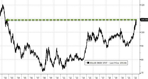 在股債市場遭遇雙殺之際,外匯市場上美元指數則大幅走高。 追蹤美元兌一籃子貨幣匯率的ICE美元指數全天上漲0.8%,升破109關口。 本月迄今,美元指數已上漲近3%,回到了7月份觸及的20年高點附近。