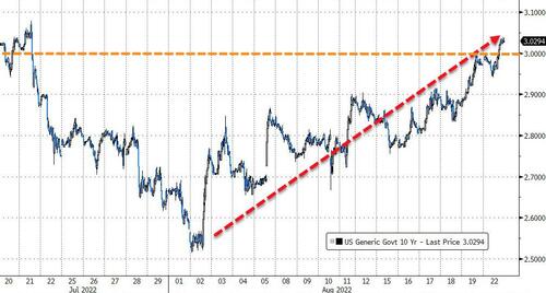 財聯社8月23日訊(編輯 瀟湘)美國股市遭遇兩個月來最大跌幅、10年期美債收益率升破3%、美元指數刷新逾20年來最高收盤位——無論你是股市、債市還是匯市的投資者,週一美國金融市場的表現,顯然都足以令你感到高度緊張......