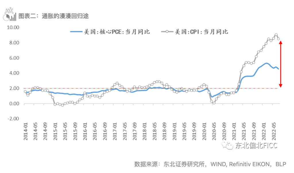 在這種情況下,這一輪比較特殊的地方,就在於就短端通脹的複雜性,這可能會使得整個通脹持續的時間會比較的長,它不是那麼容易的能夠快速回落的。 這個時候需要保持這樣一個握緊拳頭的方式堅持一段時間不鬆手也不能鬆手。 再者雖然說現在看到了通脹數據上掉頭的跡象,但是聯儲設定的目標和目前的通脹水準偏離還是太遠。
