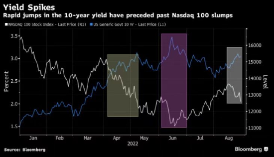 華爾街週五迎來另一波動蕩,此前鮑威爾在傑克遜霍爾年會上發出警告,歷史經驗強烈警告不要過早放鬆政策,因此限制性政策將持續一段時間。 針對美聯儲9月政策會議的期貨合約,週五某個時間點的定價是政策將收緊64個基點,鮑威爾發表講話前則為59個基點。 股市首當其衝,儘管10年期國債收益率基本持平,但以科技股為主的納斯達克100指數重挫4.1%。