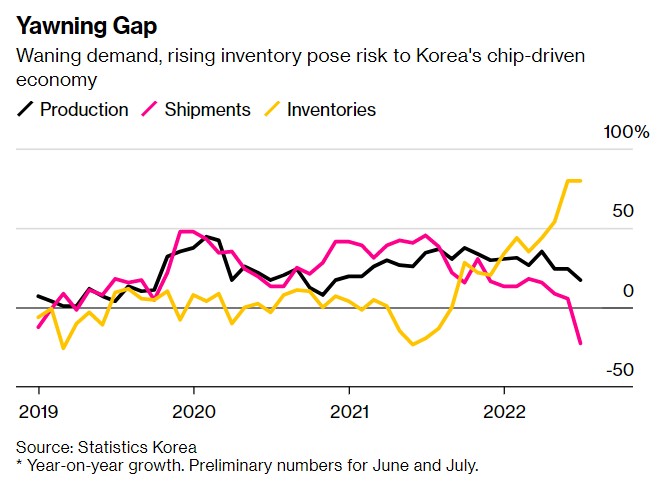 韓國芯片製造商7月出貨量出現近三年來首次下滑 庫存繼續保持高位