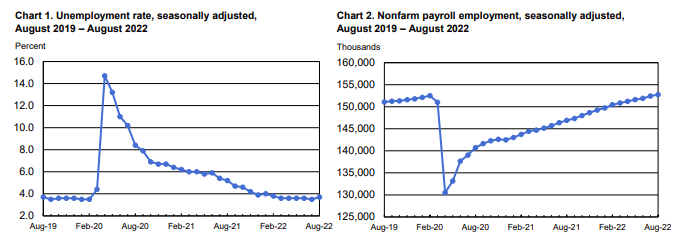 勞工統計局的報告還顯示,8月失業率從3.5%環比上漲0.2個百分點至3.7%,時隔5個月首次上升;就業參與率也從62.1%上升至62.4%,高於市場預期,但離疫情爆發前的高點63.4%仍有差距。
