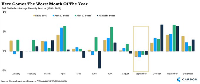 財聯社9月2日訊(編輯瀟湘)儘管美國股市週四在9月的首個交易日漲跌不一,暫時令傑克遜霍爾央行年會後持續的拋售行情出現了停頓,不過對於接下來的市場表現,許多華爾街人士眼下依然很難保持樂觀:因為立場鷹派的美聯儲,很可能讓美股一年中最疲軟的月份——9月,變得更為凶險萬分!