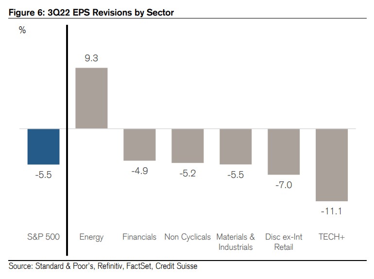 瑞信統計的每股收益預期數據顯示,金融(XLF.US)板塊第三季度預期下滑4.9%,非週期板塊下滑5.2%,材料類股和工業板塊(XLB.US,XLI.US)下滑5.5%,不包括國際零售的非必需消費板塊下滑7%。