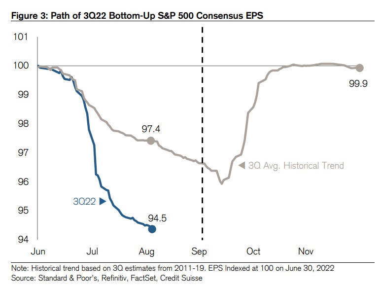 瑞信近日表示,隨著第三季度開始接近尾聲,美股市場每股收益(EPS)普遍預期也開始出現下行。該行分析師Jonathan Golub在一份報告中寫道,對於經濟衰退的擔憂和疲弱的業績指引將使得標普500指數每股收益預期在第三季度和2023年出現“顯著下滑”。