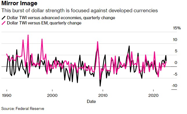 雖然美聯儲超預期收緊貨幣政策對全球貨幣產生的負面影響並不令市場感到意外,但這是多年來首次美元相對全球發達市場貨幣整體大幅走強,而不僅僅是相對新興經濟體。