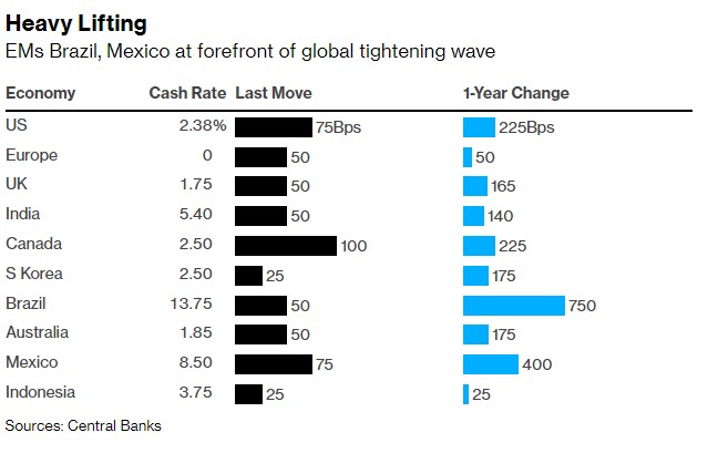全球央行跟隨美聯儲加息步伐,巴西、墨西哥等新興市場已經處於全球緊縮浪潮前沿