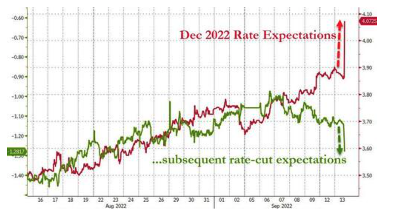 美國8月CPI數據粉碎了市場對於美聯儲「仁慈」的幻想。 掉期交易已完全定價美國9月加息75個基點,加息100個基點的可能性甚至達到20%。 市場最新定價本輪美聯儲加息終點為4.28%,在明年4月,隨後因為經濟衰退,開啟更激進的降息。