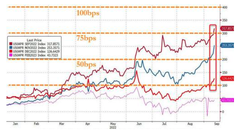 美國8月CPI數據的出爐,粉碎了市場對於美聯儲非暴力加息的幻想。 當前,美聯儲掉期交易已經完全定價美國9月加息75個基點,更驚人的是,市場預期下周美聯儲加息100個基點的可能性達到20%。
