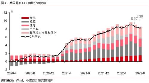 ▌美國8月CPI增速超出市場預期,能源項增速繼續回落,食品項同比增速仍在歷史高位。 美國8月CPI季調后環比上漲0.1%,高於市場預期的-0.1%,較前值0%略有上漲; 同比增速由前月的8.5%降至8.3%,但高於市場預期的8.1%。 核心CPI季調后環比增速為0.6%,高於前月的0.3%; 同比增速為6.3%,高於前月的5.9%,且高於市場預期的6.1%。 按食品、能源與核心CPI三分法看,8月美國CPI能源項同比增速為23.8%,較前月的32.9%繼續回落,而環比增速則從上月-4.6%降低至-5.0%; 但食品項維持增長態勢,環比增速為0.8%,而同比增速11.4%,處於1979年5月以來最高位。