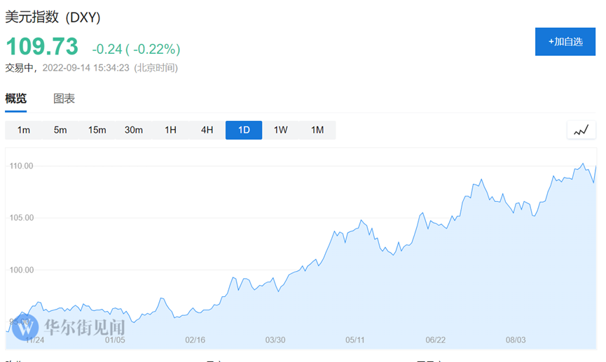 美元指數週二止步四連跌漲1.5%,重回109,逼近20年來的高位。 截止週三發稿,美元指數報109.73,日內小幅下挫0.2%。