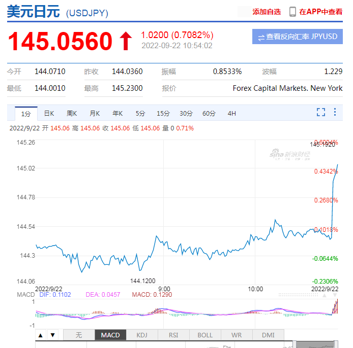 美元兌日元USD/JPY站上145關口,為1998年8月以來首次,日內漲幅達0.6%。 本月迄今已累漲超600點或4.3%,較8月低位累漲近1500點或11.2%。 此前日本央行維持利率不變。