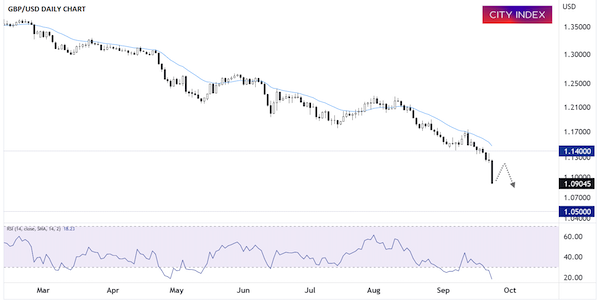 韋勒表示,交易員關心短線止跌位。英鎊/美元下破了疫情以來低點,可能適時地探至1985年低點,即1.05區域。但鑑於14天RSI嚴重超賣,價格或先在空頭回補帶動下回升,前提是未來一周左右里金融市場保持相對穩定,英國決策層今後幾天也可能會干預市場、阻止英鎊暴跌勢頭,但可能性較小。“英鎊/美元上周大舉下破前支撐位1.14區域,意味著交易員本週會在反彈至1.11或1.12上方時擇機逢高沽出,只有回到1.14上方,空頭才可能暫時罷手。”