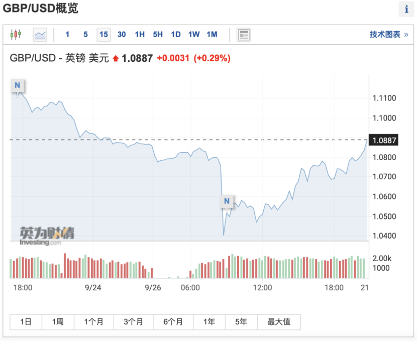 率先遭受衝擊的是,英國外匯市場。9月26日早間,英鎊遭遇驚險一刻,英鎊兌美元匯率一度暴跌超5%,一度創出1985年以來新低,後續一路反彈,截至26日,英鎊兌美元匯率為1.0887。