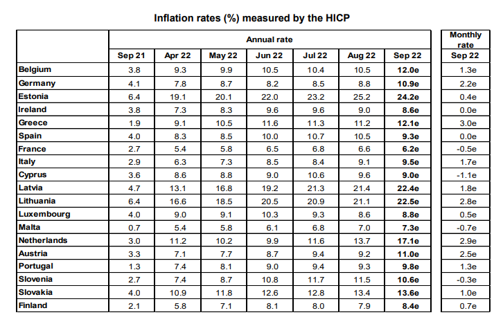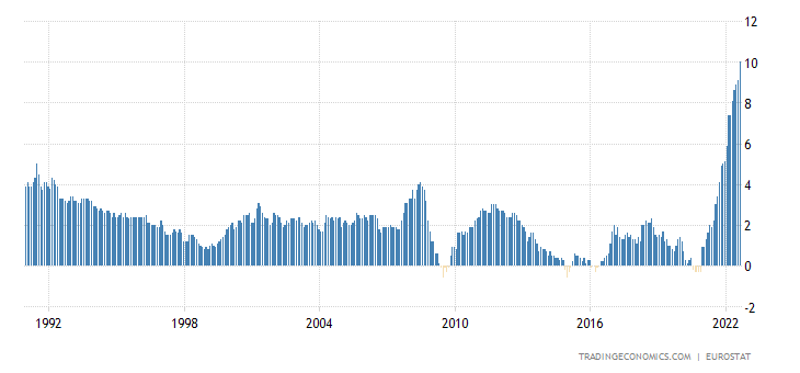 這使得歐元區通脹率同比漲幅錄得10%,刷新歷史新高,並顯著高於市場預測的9.7%和8月的9.1%。