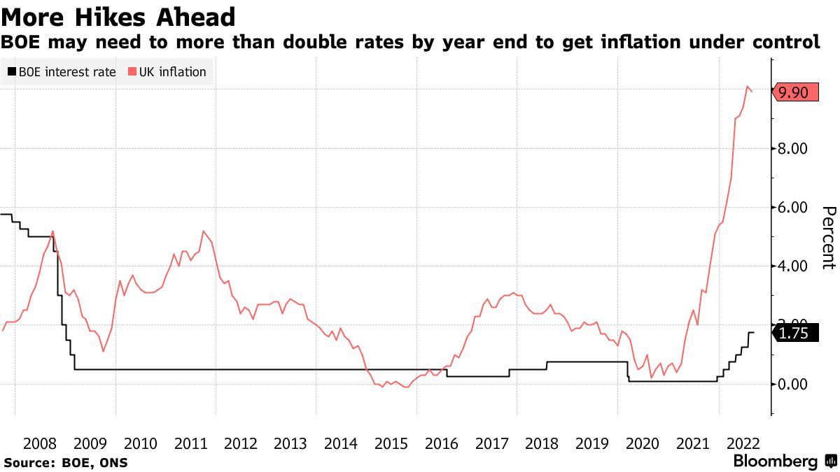 英國央行可能需要在年底前將利率提高一倍以上,才能控制住通脹