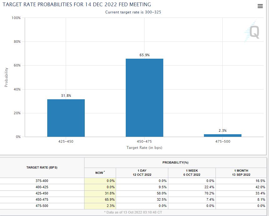 然而,若通脹高燒不退,促使美聯儲在12月也加息75個基點,今年底美國基準利率區間上限會升至4.75%,突破了美聯儲對利率的峰值預測。交易員們也在CPI數值後押注美聯儲將變得更加激進,對明年3月前的基準利率定價已接近5%,12月加息75個基點的概率從34%升至60%。