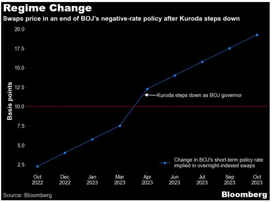 彭博社收集的數據顯示,隔夜指數掉期已經充分反映出日本央行負利率政策將在黑田東彥明年4月份離任前後結束,這意味著日本央行將把短期政策利率從-0.1%上調10個基點。