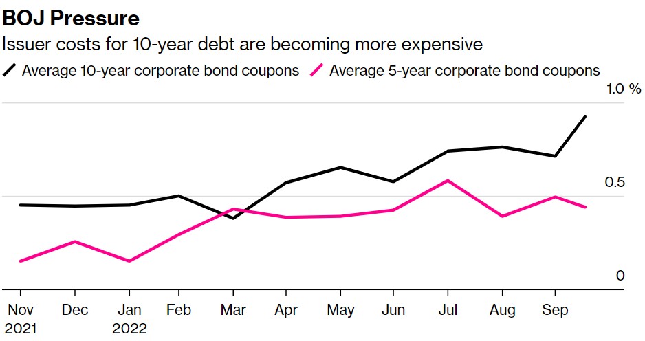 在日本信貸市場,投資者對較長期債券收益率飆升的風險要求更高的溢價。 彭博彙編的數據顯示,10月份發行的10年期公司債券的平均票面利率升至0.92%,高於4月份本財年開始時的0.57%。 相比之下,5年期日本國債的平均利率同期小幅降至0.44%。