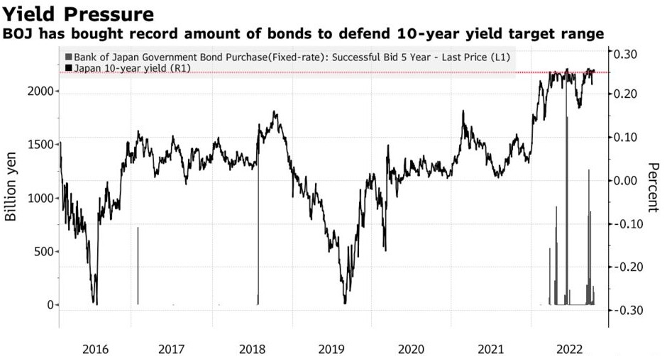 日本央行的超寬鬆政策已將日元匯率推至1990年以來的最低水準,儘管日本財務省為貶值進行了干預,交易員們關注的是日本和美國基準收益率之間不斷擴大的差距。 越來越多的人猜測,隨著全球其他主要央行不斷加息,人日元貶值最終將迫使日本央行讓10年期日債收益率走高。