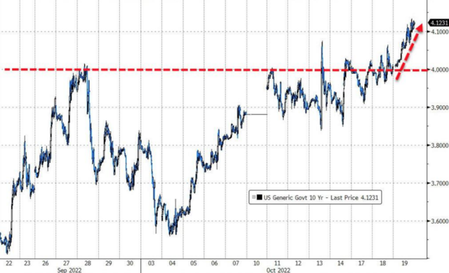 10月19日週三,隨著經濟衰退的擔憂蔓延, 美國國債收率全線走高,10年期美債收益率盤中一度走高14個基點,升至4.136%,為2008年7月23日以來的最高水平。