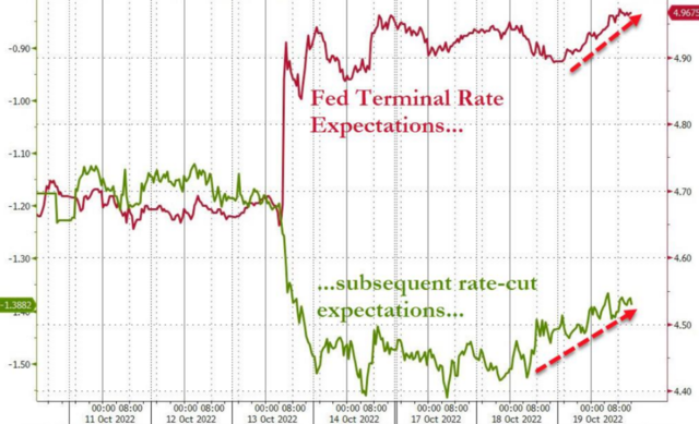 目前市場普遍預期,美聯儲將在11月初的議息會議上連續第4次加息75個基點。週三,美聯儲利率軌跡預期也出現了趨向鷹派的轉變,市場目前預期美聯儲本輪加息的高點將達到了4.977%左右。