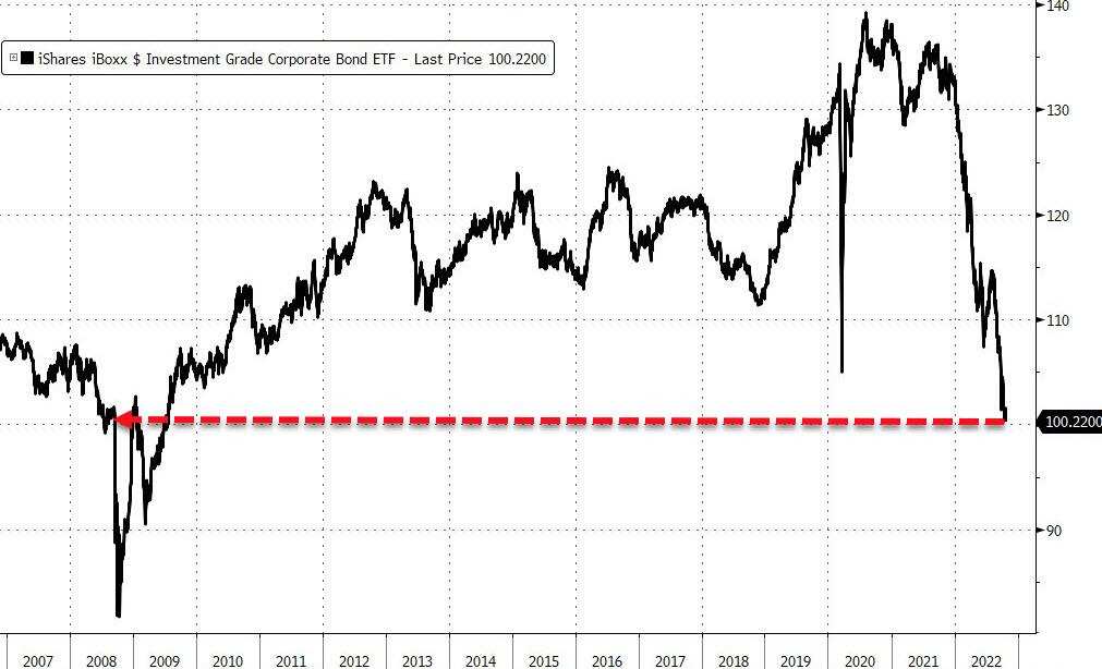數據顯示,跟踪美國投資級公司債券市場的債券指數ETF-iSharesiBoxx投資級公司債(LQD.US)週三跌至100美元的低點,為2009年以來首次。