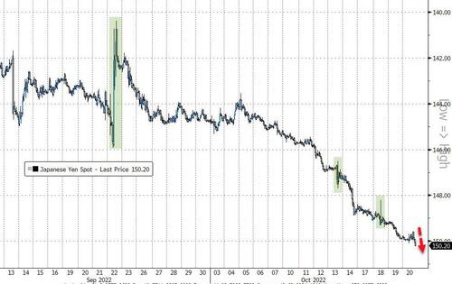 財聯社10月21日訊(編輯 瀟湘)隨著美元兌日元(148.801.1700, 0.79%, ) 匯率30多年來首次升破150,這個全球外匯市場年內最受矚目的貨幣對走勢,如今顯然已經不再單單是日本決策層需要煩惱的問題,甚至一不小心,就可能在全球市場投下一顆當量足以媲美英債風暴的重磅“核彈”!