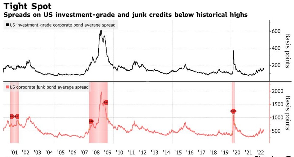 高盛預計,到年底,美國投資級債券與美國國債利差將擴大至175個基點,垃圾級債券利差將攀升至625個基點。 然後,它們可能會在2023年上半年收窄。
