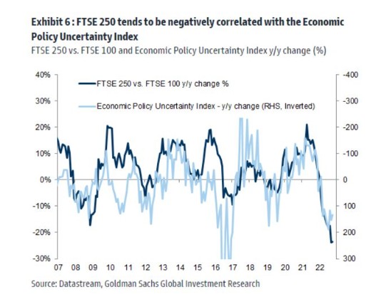 可以肯定的是,在蘇納克的領導下,「緩慢而穩定」的方法對依賴英國經濟健康的英國公司來說是積極的。 Frikkee表示,“改變立場是最糟糕的做法。 “而高盛的一項分析顯示,當經濟政策的不確定性增加時,富時250指數(FTSE 250)往往會下跌。