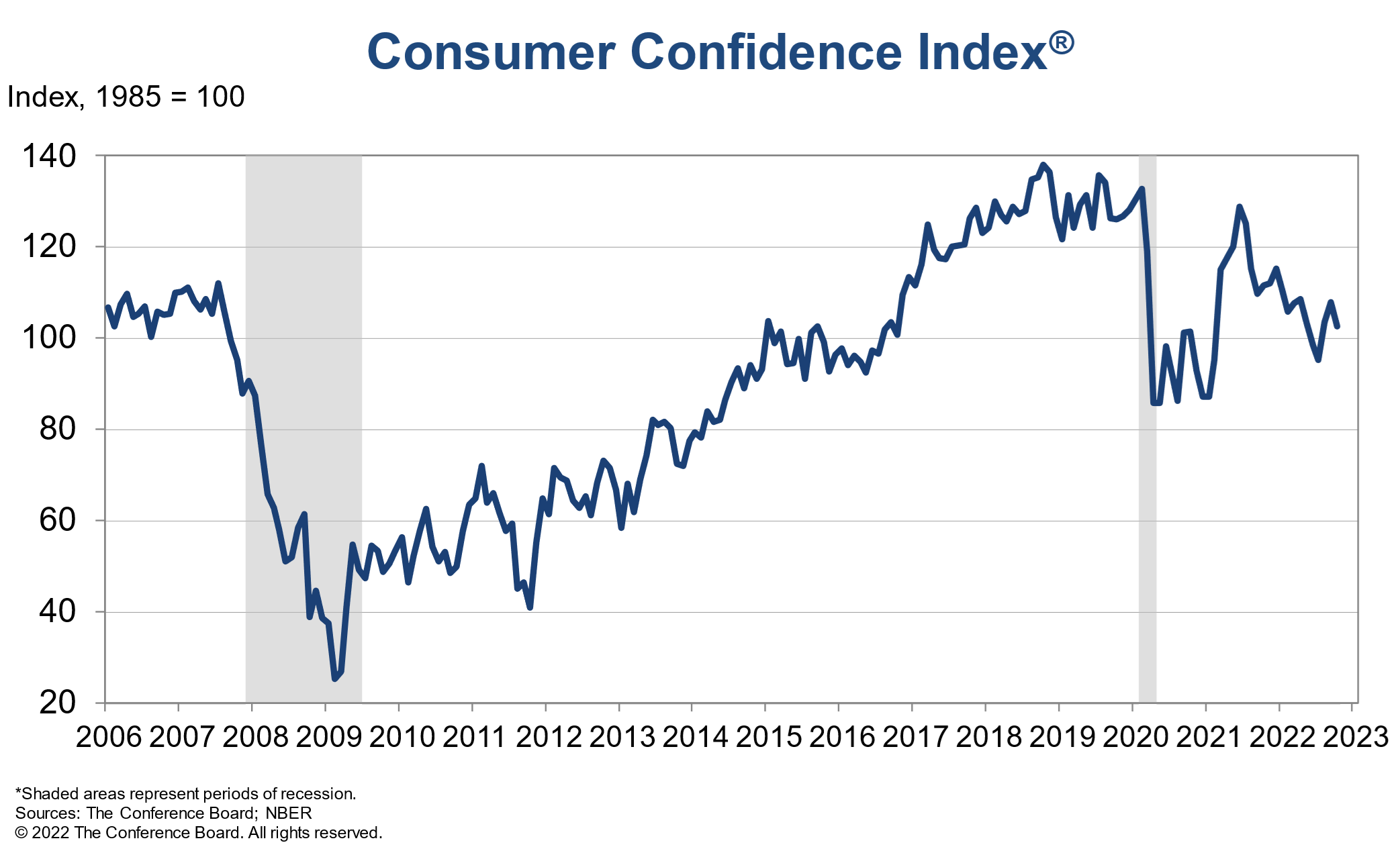 不僅如此,消費者現狀指數也從9月的150.2急劇下降至138.9,衡量消費者對未來6個月前景的預期指數也從79.5下降至78.1。