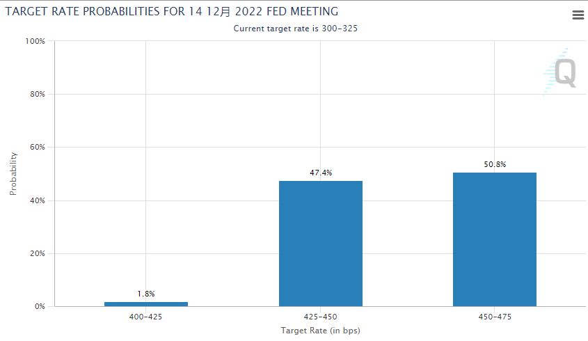 根據芝商所的Fed Watch工具顯示,目前市場普遍認為美聯儲鐵定會在下周的議息會議上加息75個基點。 不過對於12月加息幅度的預測,支援50個基點和75個基點的陣營幾乎五五開。