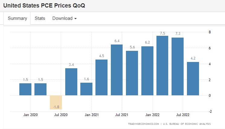 通貨膨脹數據方面則有一些好消息。根據消費者行為進行調整的生活成本指數——連鎖加權價格指數在第三季度上漲4.1%,遠低於經濟學家預測的5.3%的漲幅。此外,GDP數據中的個人消費支出價格指數(PCE)——也就是美聯儲青睞的通脹指標,僅上漲了4.2%,較上一季度的7.3%大幅下降。