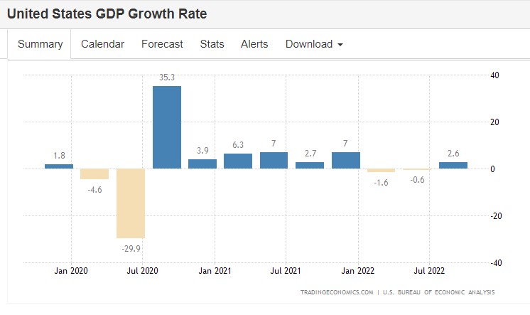 美國經濟數據分析局週四公佈的最新數據顯示,美國季度GDP在今年第三季度首次實現年內正增長,至少暫時緩解了市場對高通(114.7, -3.41, -2.89%)脹的擔憂情緒。最新的GDP初值數據是7月至9月期間美國所有商品和服務產出的總和,在這期間的GDP年化季度增長率2.6%,超過經濟學家預測的2.3%。