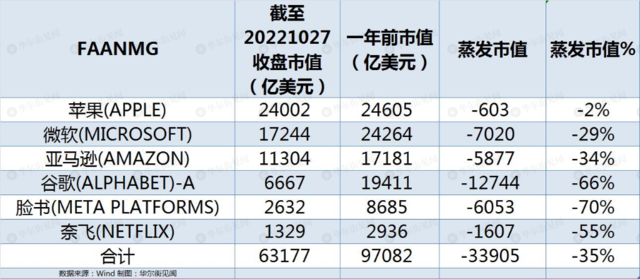 在截至10月27日的一年裡,FAANMG的市值合計減少了3.39萬億美元,同比下滑35%。
