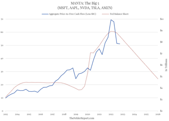 費爾德投資研究(Felder Investment Research)創始人Jesse Felder指出,如果把微軟、蘋果、英偉達、特斯拉( 228.52 , 3.43 , 1.52% )和亞馬遜(MANTA)的市值與它們的總自由現金流進行比較,你會發現它們的預期市盈率是50倍。