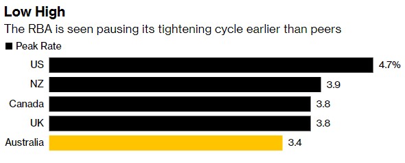 貨幣市場定價表明,到2023年中期,利率將達到略低於4%的峰值。 在今天的聲明之前,彭博社調查的經濟學家的中值顯示,澳洲聯儲的利率峰值在3.5%左右。