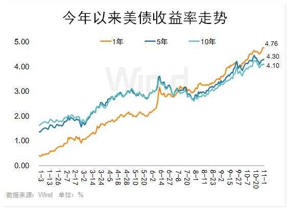 隨著美聯儲持續加息,其國債收益率也一路飆升。Wind數據顯示,今年以來各期美債收益率均出現大幅上升。其中1年期從年初的0.4%已上升至目前4.76%,並再度創出年內新高;5年期則從年初1.37%到最新4.30%,但較10月下旬有所回落;此外10年期從年初1.63%大幅上升至最新4.10%,較10月底最高4.25%也有所下降。