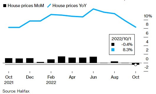 智通財經APP獲悉,抵押貸款機構哈利法克斯(Halifax)表示,英國上個月房價下跌0.4%,為四個月來的第三次下跌。 年增長率從9.8%降至8.3%。 主要由於抵押貸款利率上升和經濟前景黯淡抑制了購房需求,英國房價正以近兩年來的最大速度下跌。