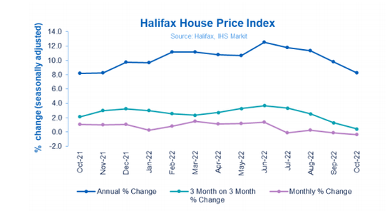 英國抵押貸款機構Halifax週一(11月7日)公佈的數據顯示,繼9月環比下跌0.1%之後,10月英國房價環比下跌0.4%,一套住房的平均成本降至292598英鎊。