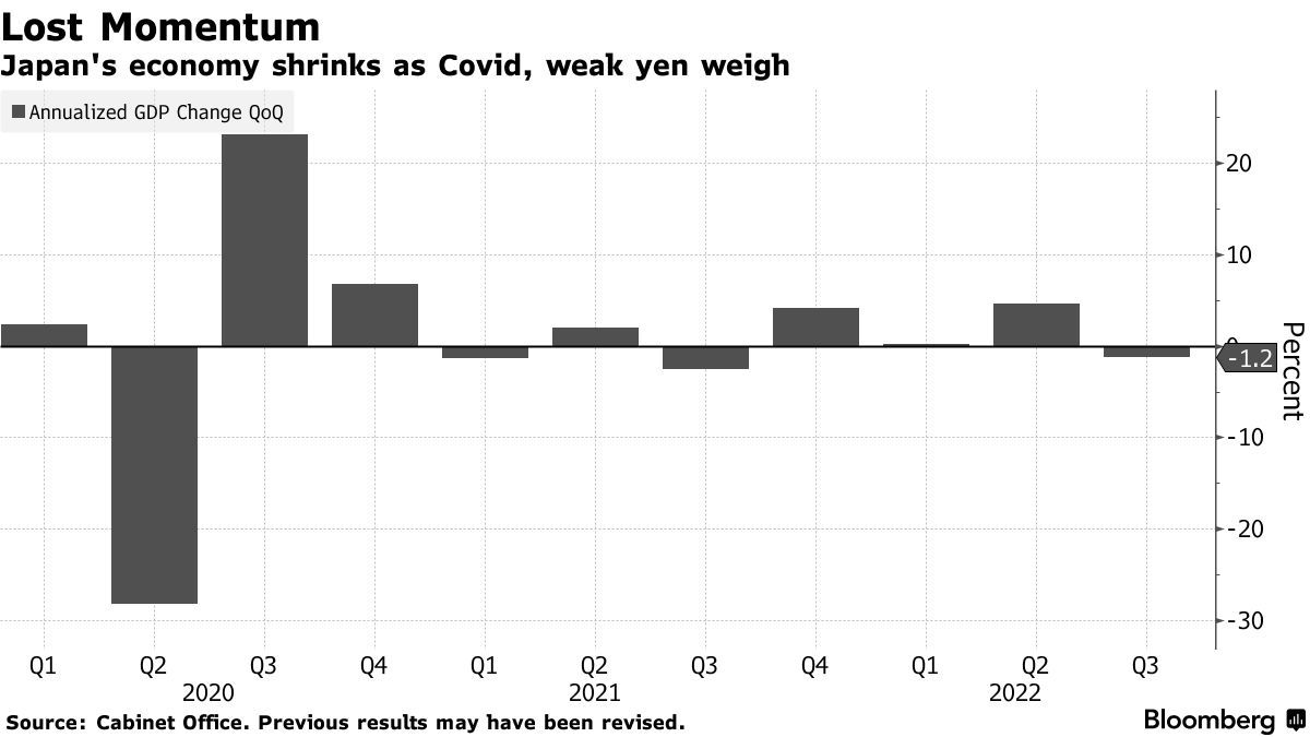 日本經濟在截至9月的3個月裡意外萎縮,主要因日元匯率歷史性暴跌打擊了經濟增長勢頭,在全球經濟放緩的擔憂日益加劇的情況下,日本經濟在新冠疫情后的全球經濟復甦中顯得十分脆弱。日本政府週二公佈的官方數據顯示,日本第三季度實際國內生產總值(GDP)折合成年率(年化季率)萎縮了1.2%,這是去年以來首次出現負增長,經濟學家此前預期為增長1.2%。